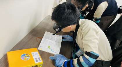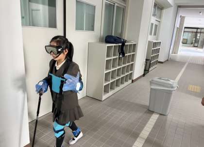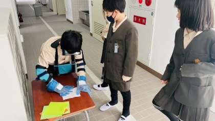 人権実践の取り組みとして、高齢者擬似体験を行いました。疑似体験装具(ヘッドホーンや特殊眼鏡、手足の重りなど)を装着して、日常生活動作を擬似的に体験することで、身体的な変化(筋力、視力、聴力などの低下)を知り、高齢者の気持ちや介護方法、高齢者とのコミュニケーションの取り方を体験的に学ぶことができました。