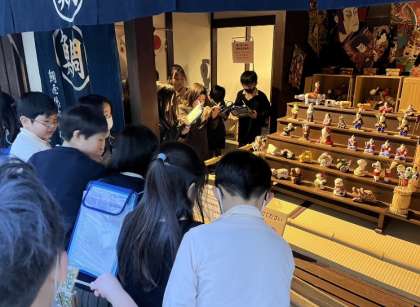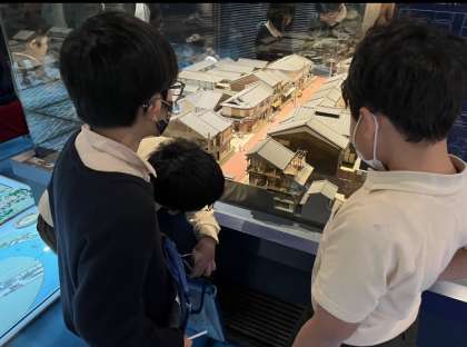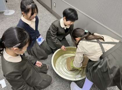 午前、午後の2グループに分かれて「くらしの今昔館」に社会見学へ行きました。体験学習では、昔の道具を実際にさわったり、使ってみたりすることができました。今昔館でたくさんの建物や模型を見て、昔の人々の暮らしを学ぶことができました。