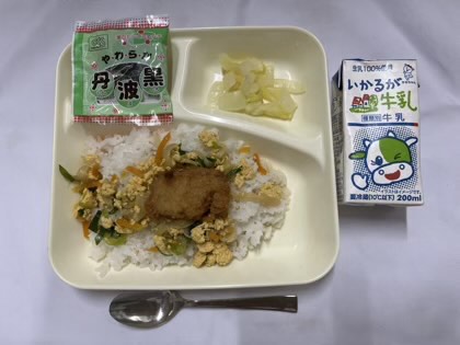 「カツ丼、白菜の甘酢あえ、ソフト黒豆、牛乳」です。