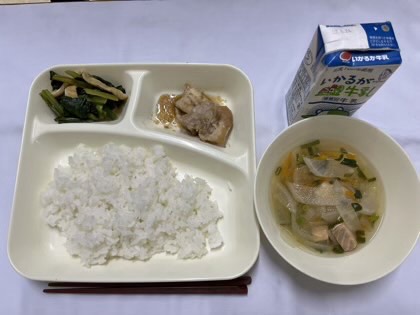 「鶏肉の甘辛ソースかけ、小松菜の炊いたん、船場汁、ごはん、牛乳」です。