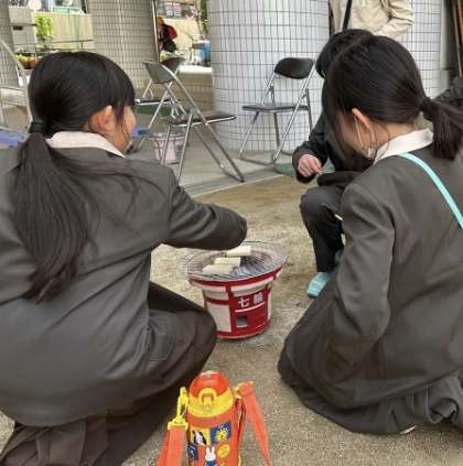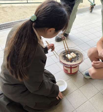 社会科の学習で、七輪体験を行いました。昔の人は毎日、七輪を使って料理をしていたと聞いた子ども達はとても驚いていました。七輪を使っておもちを焼いて食べました。