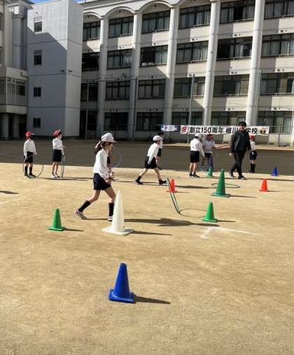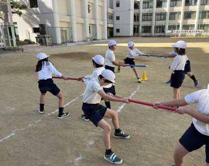体育では、いろいろな道具を使って体を動かしています。今日は、フラフープや棒を使って運動しました。