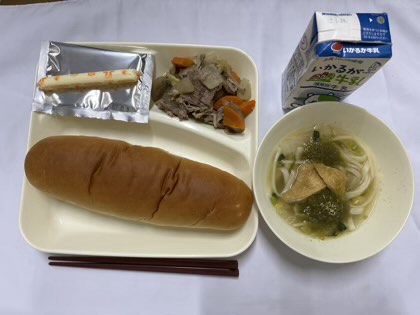 「豚肉とごぼうの煮もの、なにわうどん、棒チーズ、黒糖パン、牛乳」です。