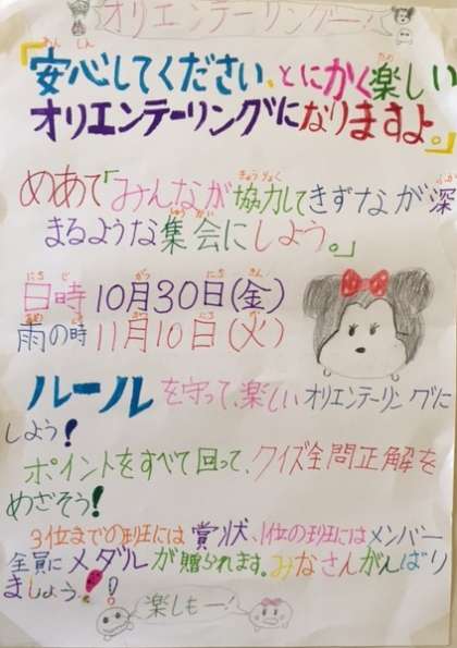 運営委員会の子どもたちがかいたオリエンテーリングポスターです。校内数か所に手作りのポスターが貼られています。