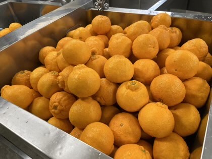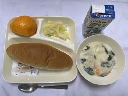 「ほうれん草のクリームシチュー、キャベツのサラダ、デコポン、コッペパン、りんごジャム、牛乳」です。