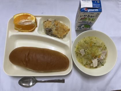 「押し麦のグラタン、豚肉と野菜のスープ、デコポン、黒糖パン、牛乳」です。
