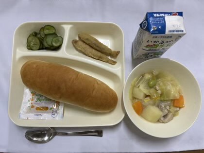 「わかさぎフライ、きゅうりのピクルス、洋風煮、コッペパン、アプリコットジャム、牛乳」です。