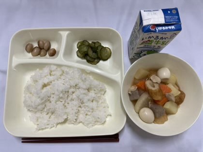 「関東煮、きゅうりの梅風味、とら豆の煮もの、ごはん、牛乳」です。