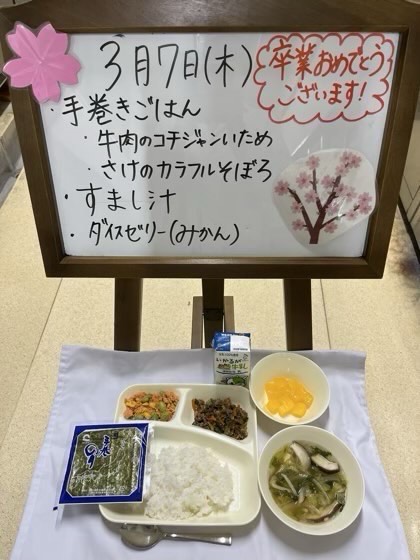 「手巻きごはん(牛肉のコチジャンいため、さけのカラフルそぼろ)、すまし汁、ダイスゼリー(みかん)、牛乳」