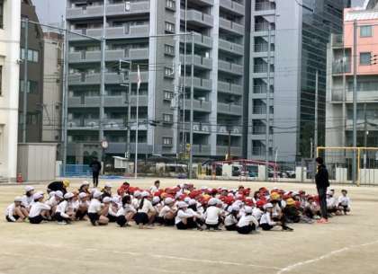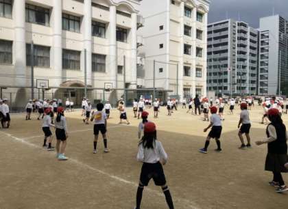 4年生の全クラスが運動場に集まり、ドッジボールをしました。残り少ない4年生での生活を楽しんでいました。