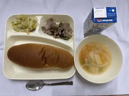 「豚肉のガーリックやき、ツナとキャベツのソテー、スープ、黒糖パン、牛乳」です。