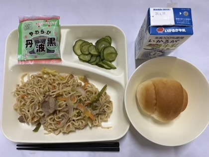「焼きそば、きゅうりのしょうがづけ、ソフト黒豆、ミニコッペパン」です。