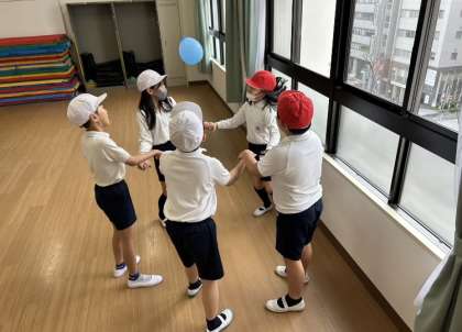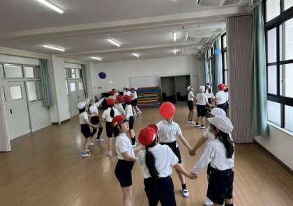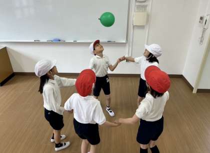 体ほぐしの運動をしました。友だちと協力して、風船を落とさないように楽しく運動しました。