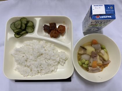 「まぐろのオーロラ煮、豚肉と野菜の煮もの、きゅうりの赤じそあえ、ごはん、牛乳」です。