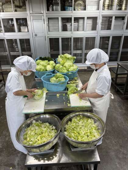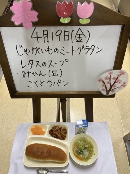「じゃがいものミートグラタン、レタスのスープ、みかん(缶)、黒糖パン、牛乳」です。
