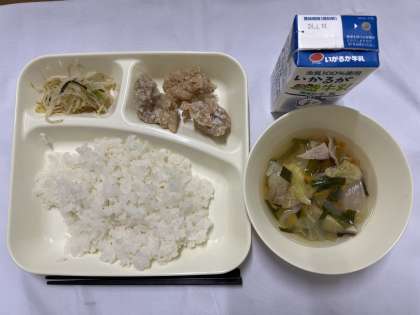 「鶏肉のからあげ、チンゲンサイともやしの甘酢あえ、中華スープ、ごはん、牛乳」です。