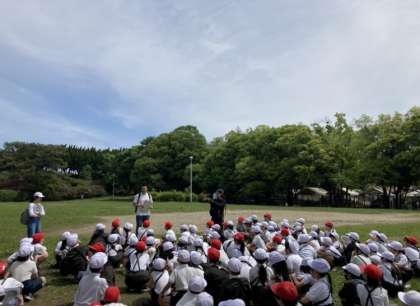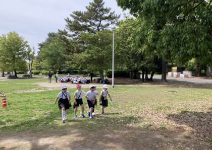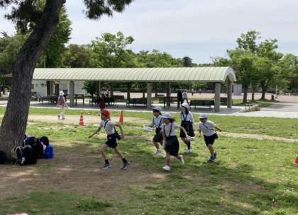 電車に乗って服部緑地公園に行きました。公園に着いてから、グループごとにオリエンテーリングをしました。