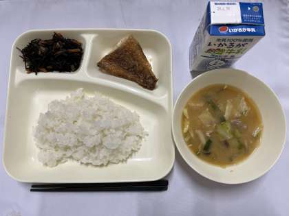 「赤魚のしょうゆだれかけ、ひじきのいため煮、豚汁、ごはん、牛乳」です。