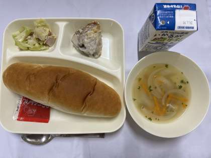 「かつおのガーリックマリネ焼き、キャベツとベーコンのソテー、押麦のスープ、コッペパン、いちごジャム、牛乳」です。