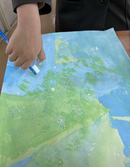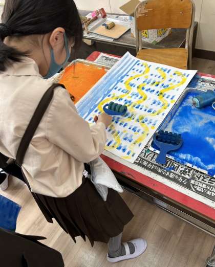 画用紙にローラーやスポンジ、ストローや歯ブラシを使って思い思いの模様を描いています。