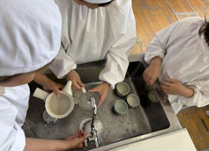 初めての実習で、湯をわかしてお茶をいれました。「少し苦い」「熱い」「でもおいしい」など感想を言いながら、湯のみを持ってほっこりしていました。