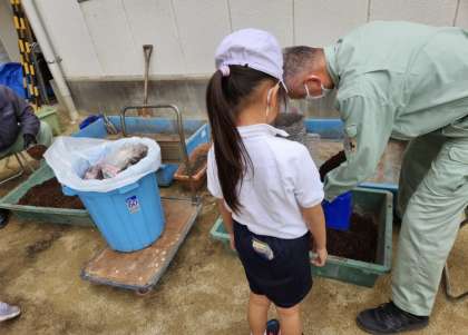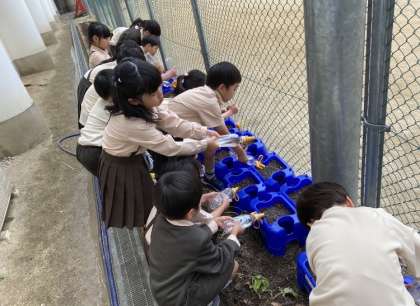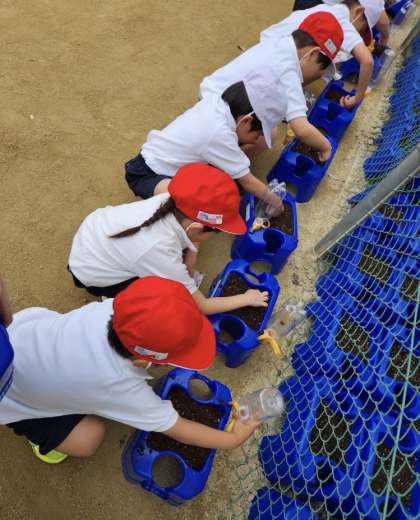 生活科で、あさがおの種まきをしました。指で穴を開けて、種を置いたら優しく土をかぶせました。その後、楽しみながら水やりをしていました。