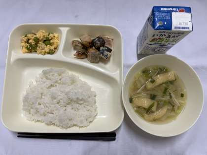 「さけのごまみそ焼き、えんどうのたまごとじ、五目汁、ごはん、牛乳」です。