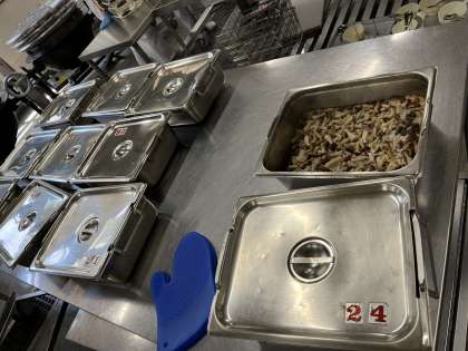 「中華おこわ」は、クラスごとにバットで蒸し焼きにしています。