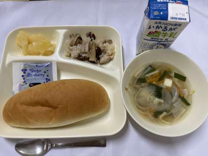 「金時豆の中華おこわ、中華スープ、パインアップル(缶)、コッペパン、ブルーベリージャム、牛乳」です。