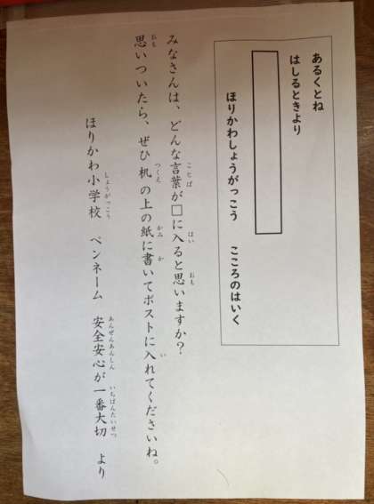 廊下に掲示している堀川小学校「こころの俳句」を募集中です。2階校長室前で提出することができます。たくさんのユーモアある俳句を期待しています。