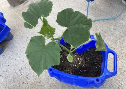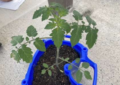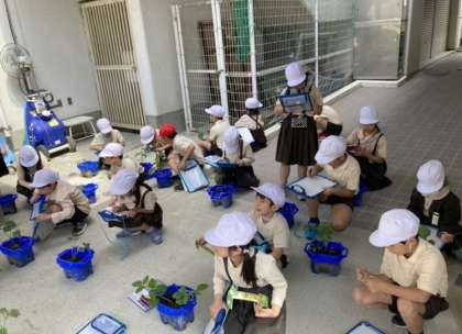 育てているトマトやピーマン、きゅうりの観察をしました。葉が大きくなり、くきが伸びてきています。