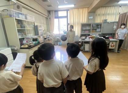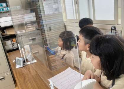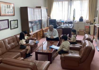 先日、2年生に案内してもらった学校を、さらに詳しく知ろうと1年生だけで学校探検をしました。校長室や職員室、事務室など、いろいろな場所で働く先生方にインタビューをしてまわりました。