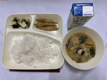 「きびなごてんぷら、わかたけ煮、みそ汁、ごはん、牛乳」です。
