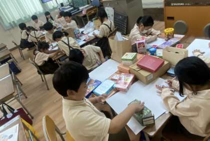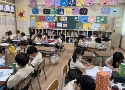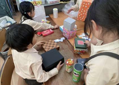 家から持ち寄った箱をつかって、かたちの学習をしています。積んだり、仲間分けをしたり、書き写したり、色々な種類の箱を手にして楽しく活動できました。