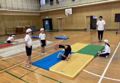 手を置く場所やあしを開くことを意識して、何度も開脚前転の練習をしました。