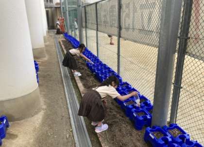 休み時間には、育てている野菜や花の水やりをしている子どもがたくさんいます。