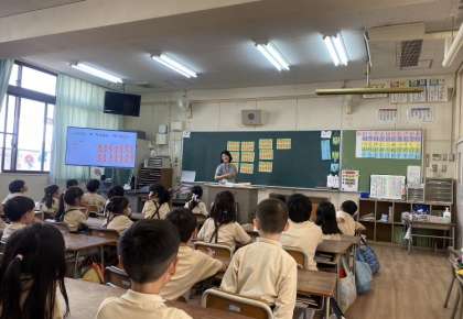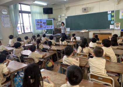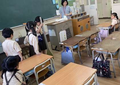 給食室の中の様子や、どのようにして給食が作られているかを知り、たくさん驚きの声が上がりました。給食室で使われているものと同じしゃもじを持たせてもらいました。