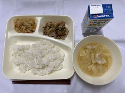 「豚肉のごまみそ焼き、切り干しだいこんのいため煮、すまし汁、ごはん、牛乳」です。