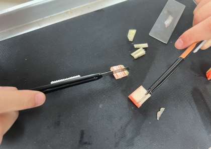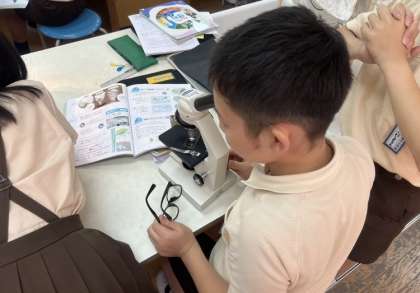 色水につけたセロリの茎、葉の断面を顕微鏡で観察しました。植物が育つために必要な養分や水はどのように吸収され、行き渡っていくのかを学ぶことができました。