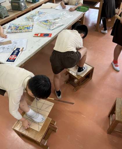 木の板をはじめてノコギリで切りました。安全に気をつけて切ることができました。切った板を組み合わせて伝言板を作ります。