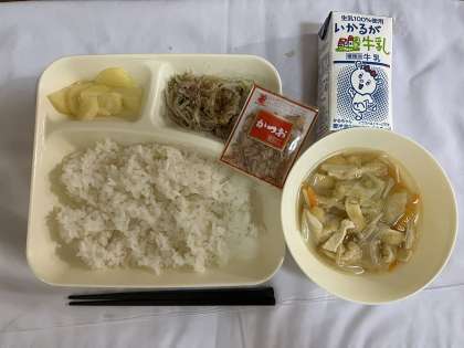 「ゴーヤチャンプルー、あげ焼きじゃが、五目汁、ごはん、牛乳」です。