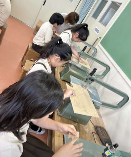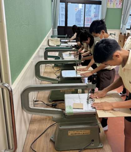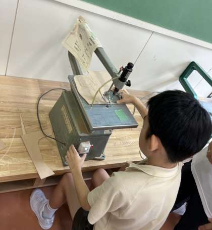 伝言板作りで、初めての電動のこぎりを使いました。ゆっくり慎重に、板を切り進めています。