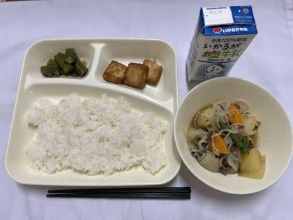 「肉じゃが、あつあげのみそだれかけ、オクラのおかかいため、ごはん、牛乳」です。