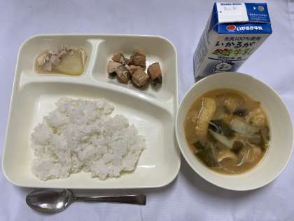 「さけのしょうゆ風味焼き、とうがんの煮物、みそ汁、ごはん、牛乳」です。