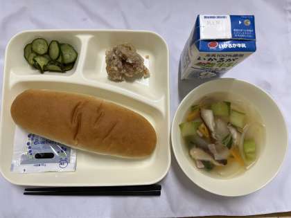 「鶏肉にからあげ、きゅうりの中華あえ、ハムとはるさめのスープ、コッペパン、ブルーベリージャム、牛乳」です。
