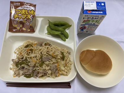 「焼きそば、えだまめ、おさつチップス、ミニコッペパン、牛乳」です。