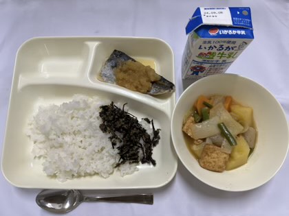 「さごしのおろしじょうゆかけ、含め煮、牛ひじきそぼろ、ごはん、牛乳」です。