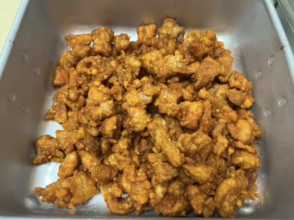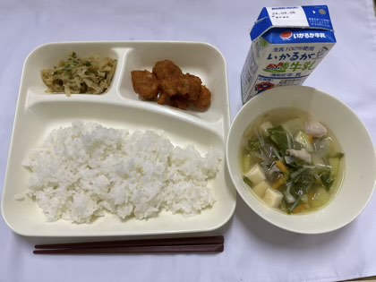「ヤンニョムチキン、切り干し大根のナムル、とうふのスープ、ごはん、牛乳」