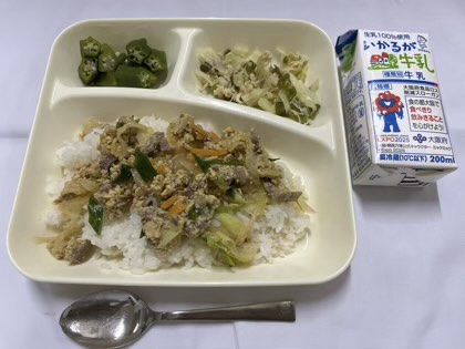 「他人丼、ささみと野菜のいためもの、オクラの甘酢あえ、牛乳」です。