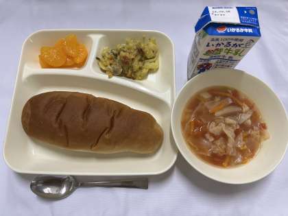 「カレーマカロニグラタン、トマトスープ、みかん(缶)、黒糖パン、牛乳」です。